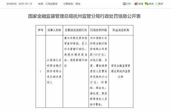 江西崇仁农商银行被罚150万:因重大关联交易未经审查和审批等