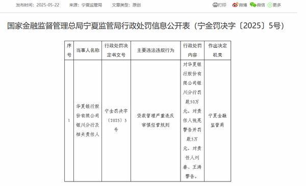华夏银行银川分行被罚款50万:因贷款管理严重违反审慎经营规则