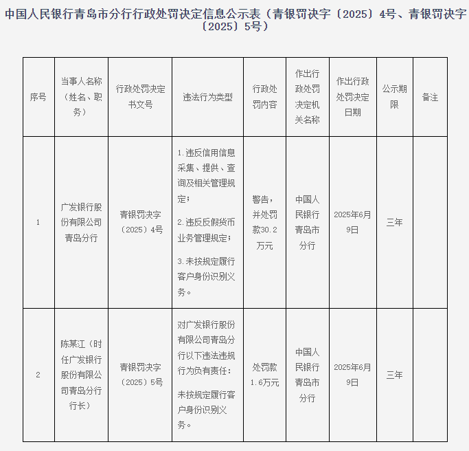 中国经济网北京6月16日讯 中国人民银行青岛市分行13日发布行政处罚决定信息公示表(青银罚决字〔2025〕4号、青银罚决字〔2025〕5号)。广发银行股份有限公司青岛分行存在以下违法行为:1.违反信用信息采集、提供、查询及相关管理规定;2.违反反假货币业务管理规定;3.未按规定履行客户身份识别义务。中国人民银行青岛市分行决定对其警告,并处罚款30.2万元。