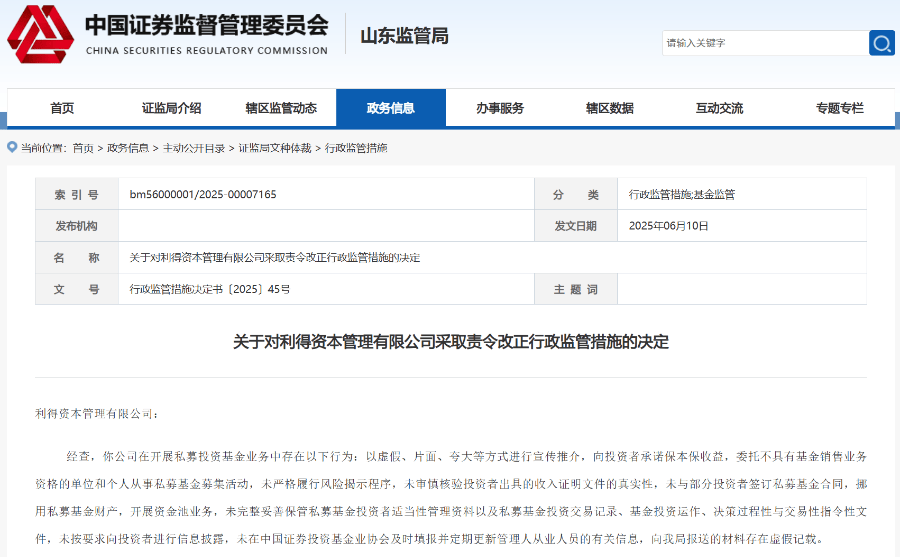 根据《私募投资基金监督管理暂行办法》(简称《暂行办法》)第三十三条规定,山东证监局决定对利得资本采取责令改正的行政监管措施,要求该私募切实采取有效措施进行整改,并在收到决定书之日起30日内提交书面整改报告。