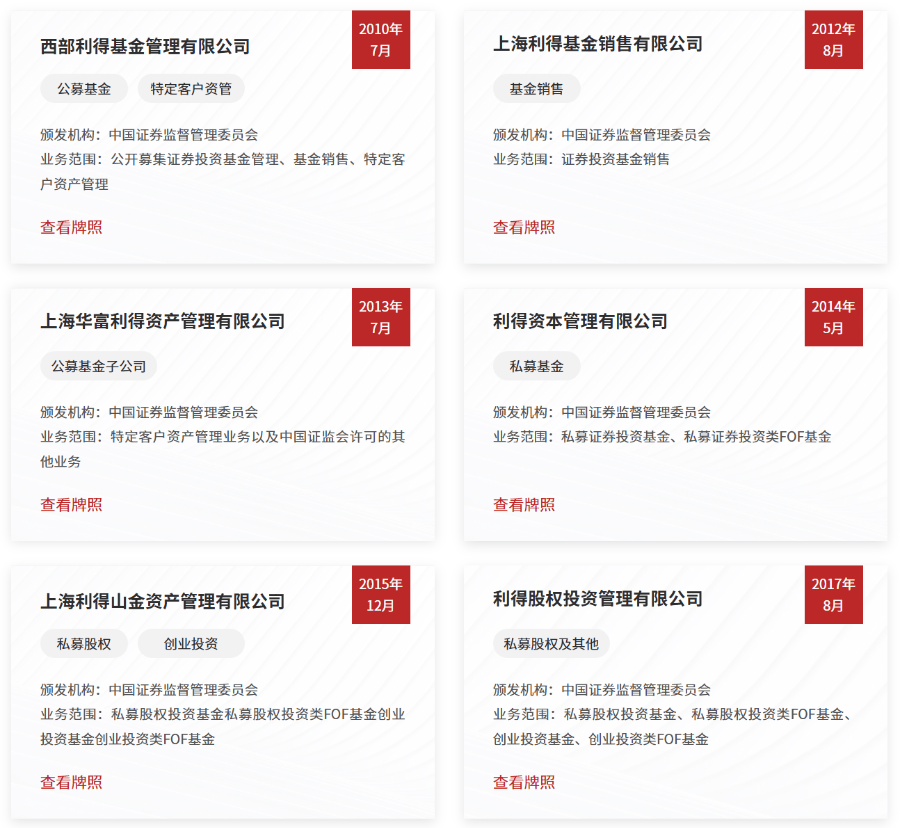 目前,利得集团旗下拥有公募基金、公募基金子公司、公募基金销售、私募证券投资基金、私募股权投资基金、私募其他投资基金等金融牌照和业务资质。
