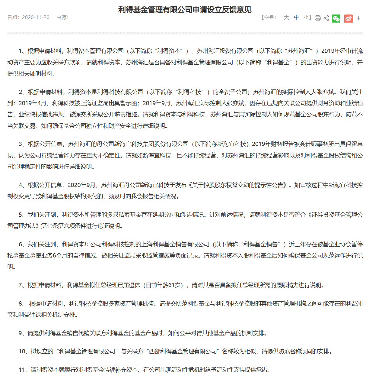 2020年11月,证监会曾发布《利得基金管理有限公司申请设立反馈意见》,从监管视角给出11点反馈意见,指明了“利得系”存在的诸多风控问题。