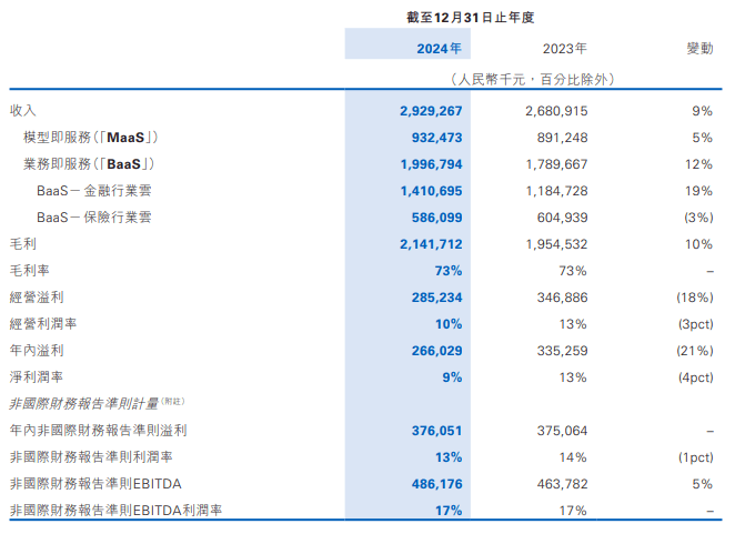 百融云创2024年年报显示,百融云创2024年实现营收29.29亿元,同比增长9%,其中,模型即服务(MaaS)部分营收9.32亿元,同比增长5%,业务即服务(BaaS)部分营收19.97亿元,同比增长12%;年内净利润2.66亿元,同比下滑21%,净利润率从13%降至9%。