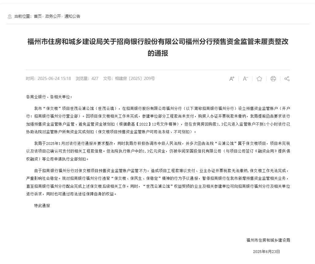 由于招商银行福州分行对保交楼项目预售资金监管账户监管不力,造成项目工程款难以支付、业主办证开票税款无法缴纳,保交楼工作无法完成,严重影响社会稳定。现对招商银行福州分行违背“保交楼、保民生、保稳定”精神的行为予以通报,暂停招商银行在福州市新增预售资金监管相关业务,直至招商银行福州分行配合完成上述保交楼后续相关工作。同时,“世茂云浦公馆”权益受损的业主及相关参建单位可向招商银行福州分行及相关单位进行诉求,同时也可通过司法途径保障自身的权益。