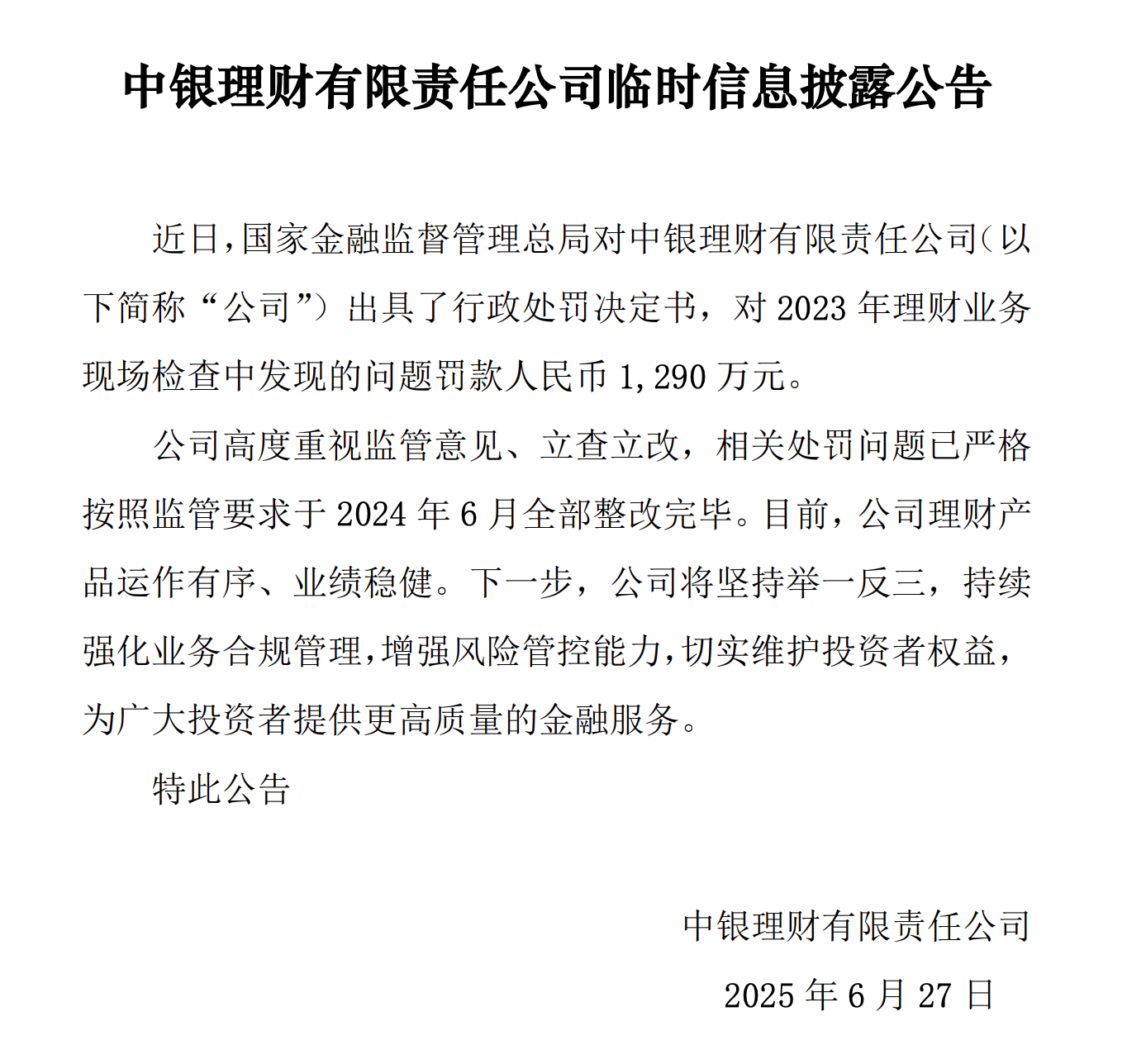 中银理财称,公司高度重视监管意见、立查立改,相关处罚问题已严格按照监管要求于2024年6月全部整改完毕。目前,公司理财产品运作有序、业绩稳健。下一步,公司将坚持举一反三,持续强化业务合规管理,增强风险管控能力,切实维护投资者权益,为广大投资者提供更高质量的金融服务。