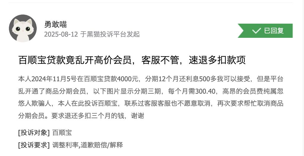 贷款会员权益带来的高客诉量和退款压力等是金融机构、助贷机构绕不开的问题。记者在黑猫投诉平台检索发现,近期“百顺宝”投诉量突出,过去30天内关于该平台的投诉达到825条,总投诉量达1.4万条。消费者主要反映的问题包括捆绑权益订单、收担保费等隐形费用,贷款利息达36%等。