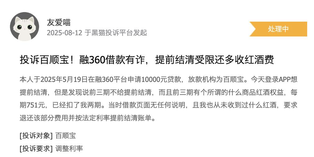 在啄木鸟投诉上,另一位消费者反映,在百顺宝平台借贷10000元,显示分期12期,每期还款945元,然而在下款后,消费者发现App显示前三期还款额为1696元,从第四期开始才是945元。前三期多出来了一笔751元的“商品分期”费用。该消费者认为百顺宝存在乱收费、欺诈等行为,要求减免前三期多收的两千多元。