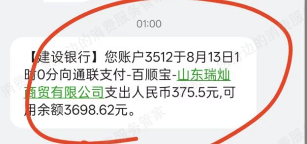 值得注意的是,尽管信合元科技官网产品页面只展示了一款“百顺宝”产品,但从消费者反映情况看,“百顺宝”中还有“百顺花”“攒花”“众攒”等多款“马甲”贷款产品,这些产品均涉及还款前三期收取会员费的相关投诉。例如,8月13日,在消费保平台上,据一位消费者反映,在众攒(原攒花)借款5000元(由辽宁某银行吉享花消费贷放款),其中,前三期账单存在捆绑收费,每期均被额外扣除375.5元,合计1126.5元,扣款短信显示由百顺宝-山东瑞灿商贸有限公司收取。消费者认为,上述费用在自己未明确知晓和同意的情况下收取,已构成“隐形扣费”,要求退回。