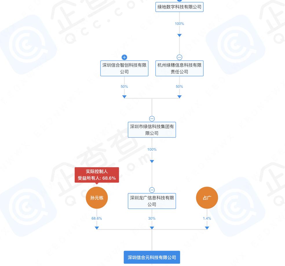 据公开资料,信合元科技是绿新集团下属子公司。股权信息显示,信合元科技注册资本4.31亿元,法定代表人占广,股东为孙元栋(持股68.6%)、深圳龙广信息科技有限公司(持股30%)、占广(持股1.4%)。其中,深圳龙广信息科技有限公司(简称“龙广科技”)由深圳市绿信科技集团有限公司100%控股。大股东孙元栋同时担任绿信集团总经理、董事。