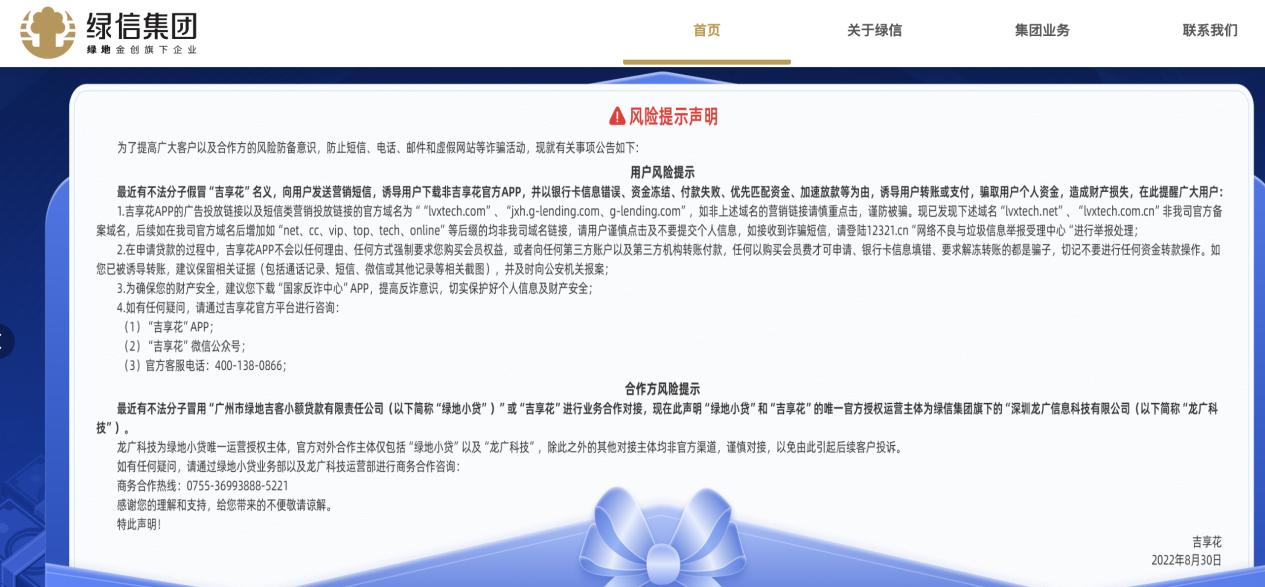 值得一提的是,据绿信集团官网公告,绿地小贷和“吉享花”的唯一官方授权运营主体为龙广科技。即“吉享花”与“百顺宝”是关联关系。