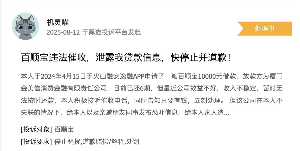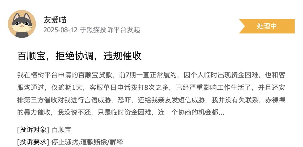 不光是权益费等乱收费问题,还有不少用户反映百顺宝违规催收。在黑猫投诉上一名消费者反映,在榕树平台申请的百顺宝贷款,前7期一直正常履约,近日因个人临时出现资金困难,仅逾期1天,客服单日电话拨打8次之多,“已经严重影响工作生活了,并且还安排第三方催收,还给我亲友发短信骚扰。”该消费者认为,自己并没有失联,百顺宝的上述行为涉嫌违规催收。