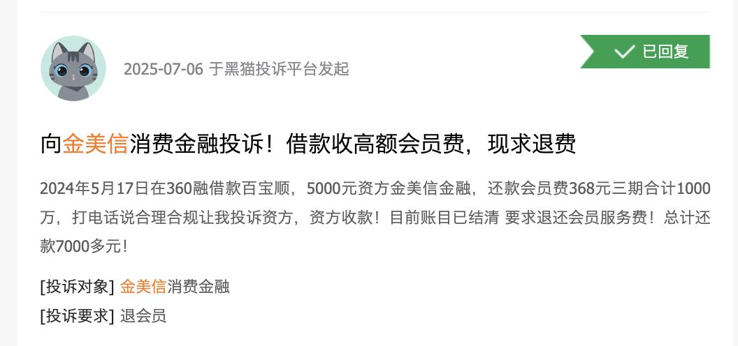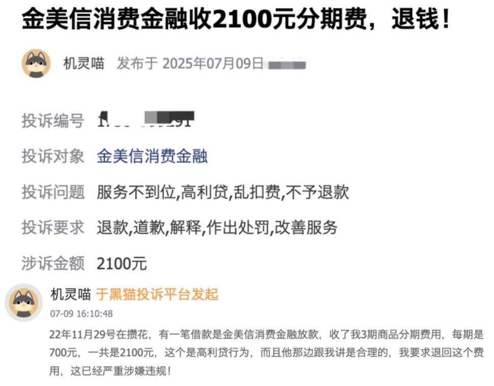 记者注意到,在和百顺宝相关的大量消费者投诉信息中,多家金融机构作为出资方也一同被波及,其中就包括金美信消金,投诉直接将“收取高额会员费、分期费”的矛头指向指金美信消金。