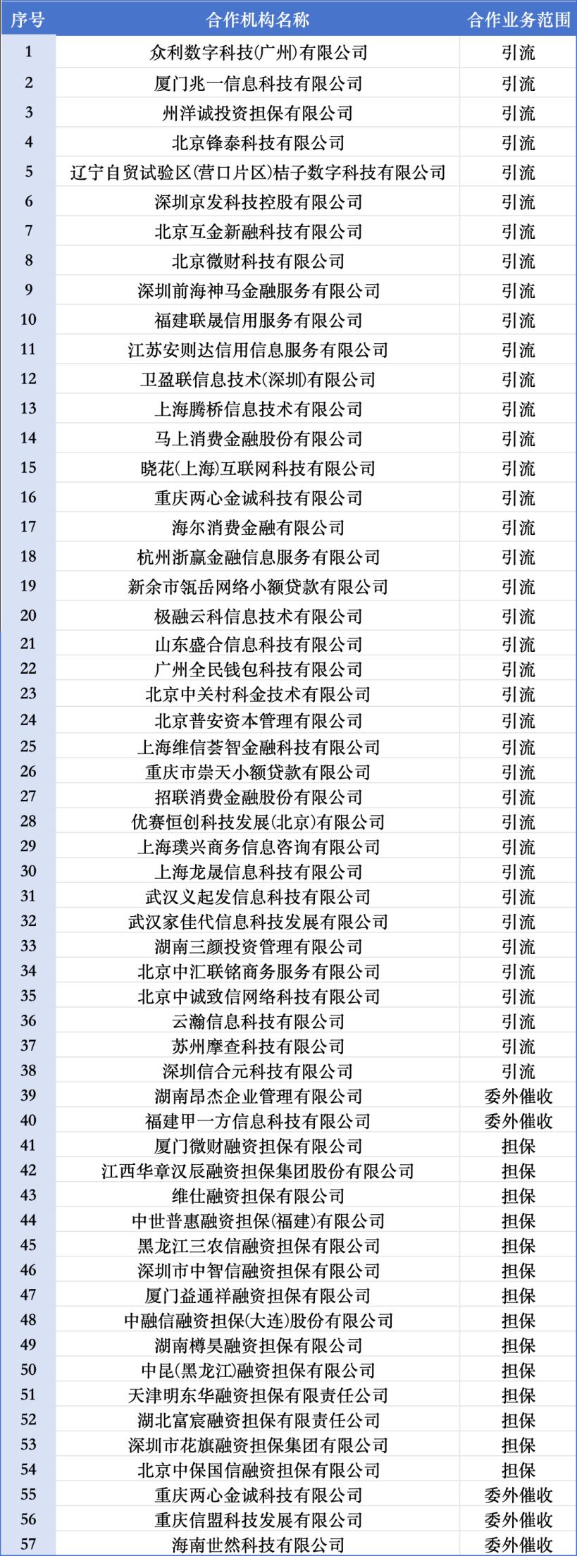 近日,金美信消金公告披露了其第三方合作机构的信息。名单显示,截至2025年8月12日,公司合作机构达57家,其中38家提供助贷引流服务、14家提供担保服务,另有5家提供委外催收服务。
