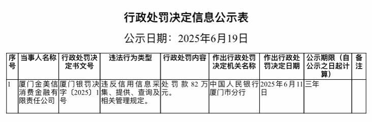 此外,今年6月19日,中国人民银行厦门市分行发布罚单显示,金美信消金因违反信用信息采集、提供、查询及相关管理规定,被处罚款82万元。