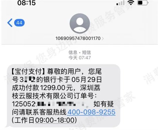 其中,青松融平台就是加收权益费的代表。最近,有消费者阿贵(化名)反映,自己5月28日在青松融借款一万元成功后,于5月29日早晨收到一笔扣款短信,账单显示是一笔1299元的会员费扣款,商家名称为会员卡。阿贵对此毫不知情,联系短信中的客服要求退回费用,而客服方面表示无法退款,称“是借款的附带条件。”