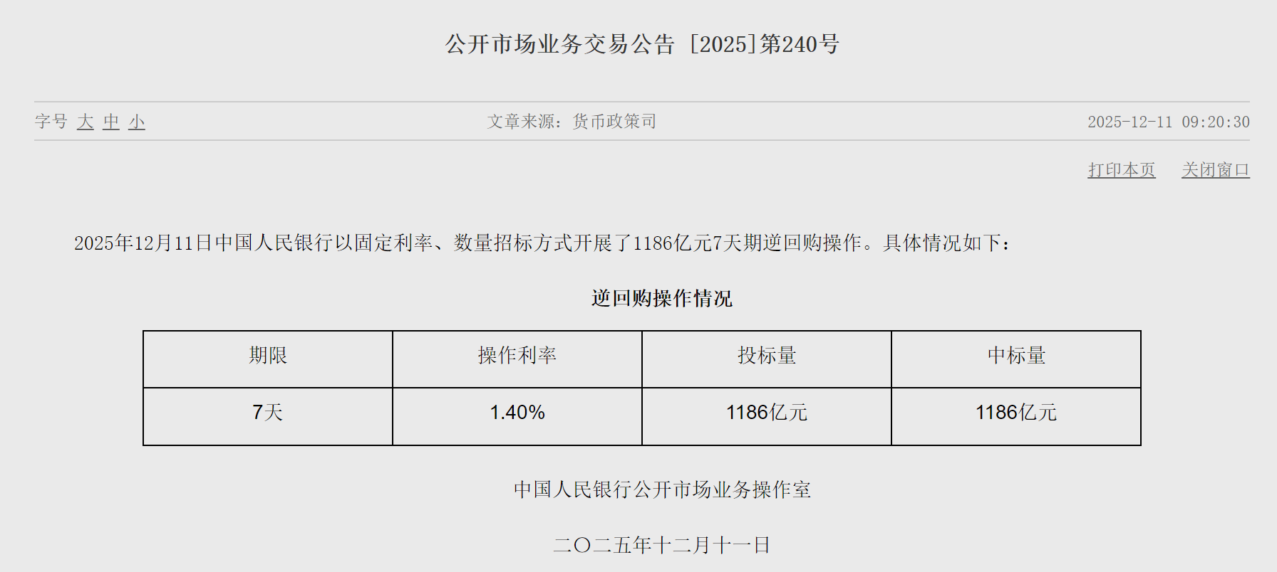 央广网北京12月11日消息(记者 冯方)12月11日,中国人民银行以固定利率、数量招标方式开展了1186亿元7天期逆回购操作,操作利率为1.40%,较前一日维持不变。人民银行此前公告显示,12月11日有1808亿元7天期逆回购到期。