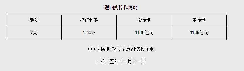 12月11日央行开展1186亿元7天期逆回购操作