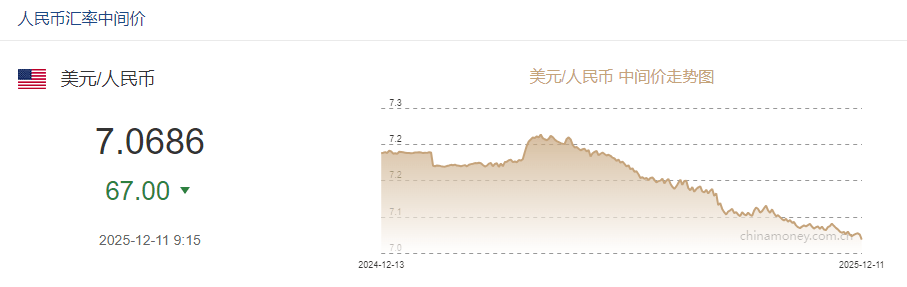 财经宏观:中新网12月11日电 据中国外汇交易中心网站消息,中国人民银行授权中国外汇交易中心公布,2025年12月11日银行间外汇市场人民币汇率中间价为:1美元对人民币7.0686元,上调67个基点。