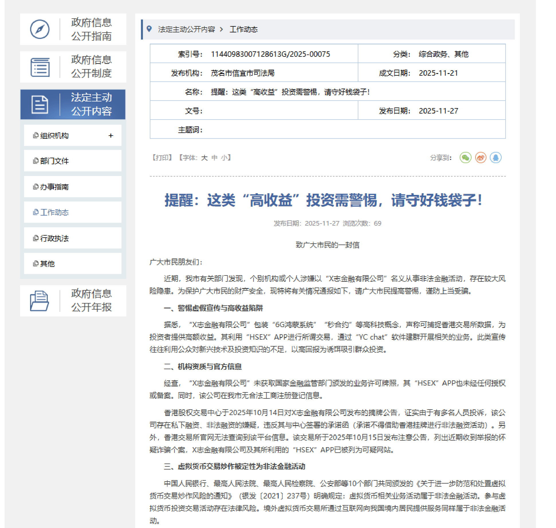 在前述11月27日广东省信宜市防范和打击非法金融活动联席会议办公室发布的《致广大市民的一封信》中称,香港股权交易中心于2025年10月14日对X志金融有限公司发布的摘牌公告,证实由于有多名人员投诉,该公司存在私下融资、非法融资的嫌疑,违反其与中心签署的承诺函(承诺不得借助香港挂牌进行非法融资活动)。另外,香港交易所官网无法查询到该平台信息。该交易所于2025年10月15日发布注意公告,列出近期收到举报的怀疑诈骗个案,X志金融有限公司及其所利用的“HSEX”app已被列为可疑网站。