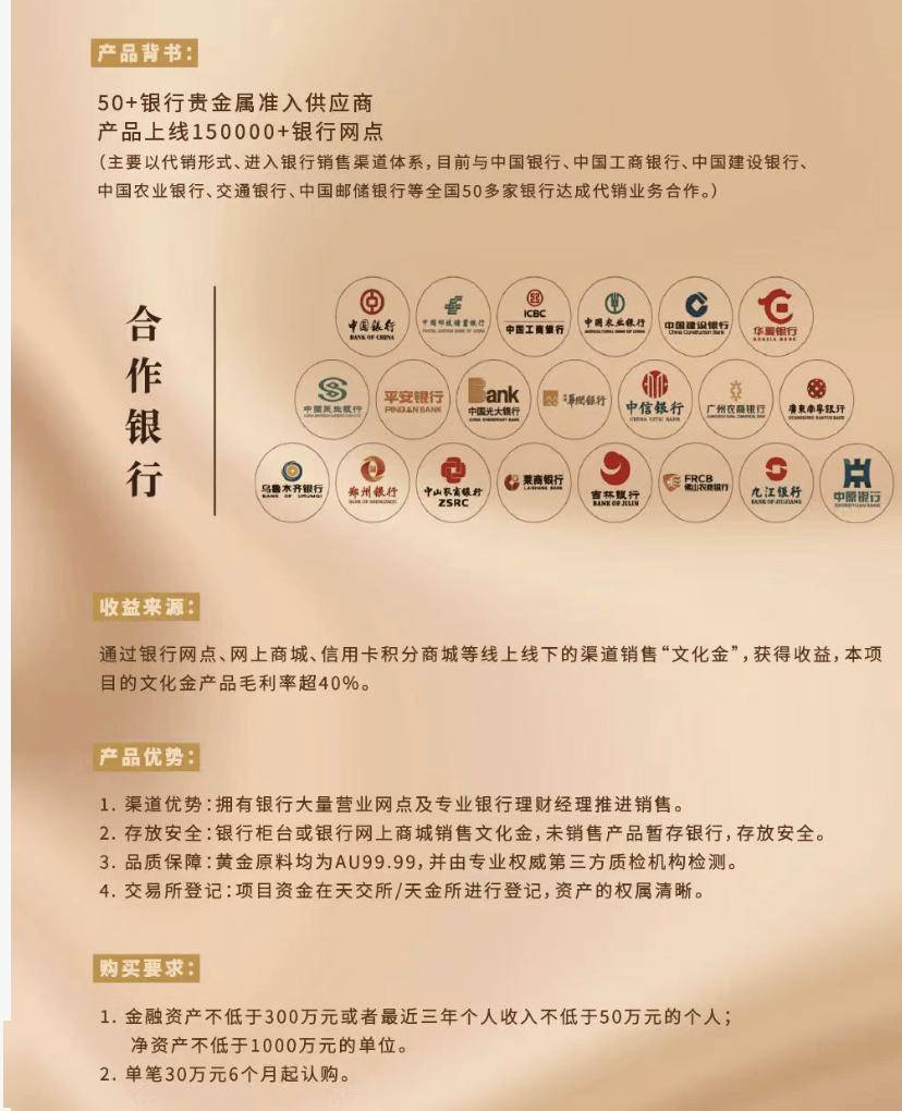 所谓文化金渠道是什么?为什么能提供高额收益?根据投资者提供的一则文化金“鑫享世承”产品宣传单,该产品自称目前是50家银行贵金属准入供货商,产品上线15万个银行网点。通过上述银行网点、网上商城、信用卡积分商城等渠道销售”文化金”,可以获得超40%的毛利率。