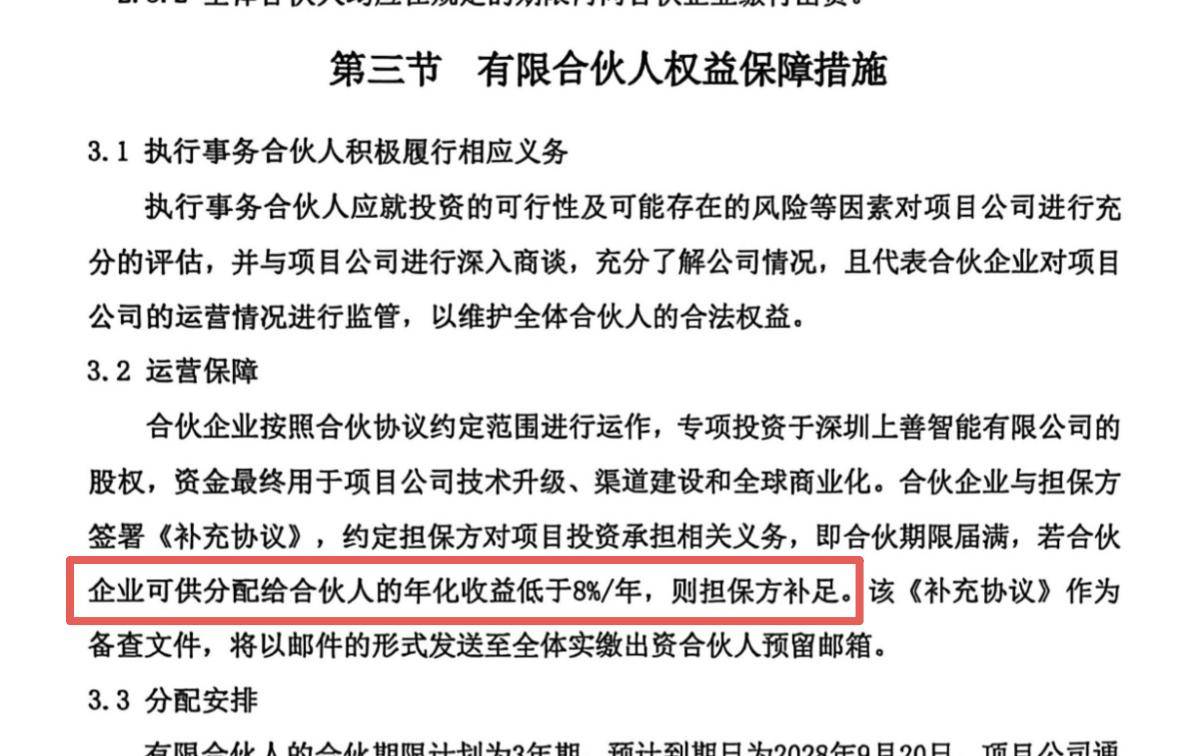 上述证券律师对记者表示,在法律文本层面,该协议没有保本条款,符合合伙企业“风险共担”的原则。但在商业实质层面,通过关联方担保“最低8%年化收益”的安排,在效果上试图构筑一个“收益保底”的预期,这与纯粹的股权投资风险特征存在出入,是判断该项目是否涉嫌“固定回报”、“实质借贷”的关键。