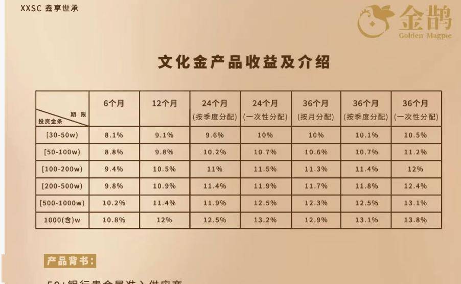 (“鑫享世承”文化金产品收益介绍。受访者提供。)