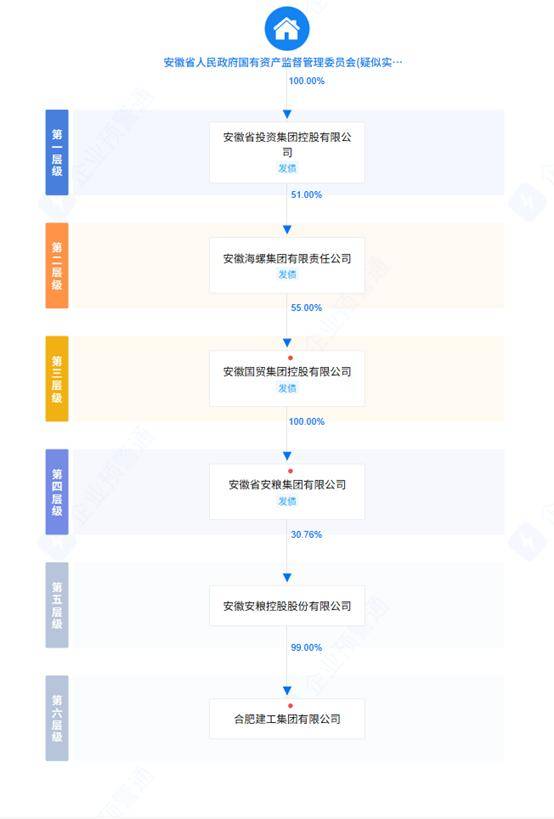 股权穿透图显示,合肥建工的直接控股股东是安粮控股,安粮控股是安徽省安粮集团有限公司(简称“安粮集团”)的子公司,而安粮集团是安徽国贸集团控股有限公司(简称“国贸集团”)的子公司,国贸集团则隶属于知名大型建材企业海螺集团。