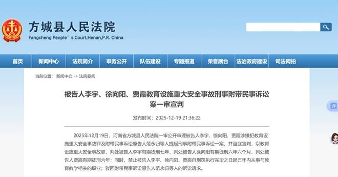 人民网方城12月20日电 (记者辛静)12月19日晚,河南省方城县人民法院发布通报,该院19日一审公开审理被告人李宇、徐向阳、贾霞涉嫌犯教育设施重大安全事故罪及附带民事诉讼原告人范永归等人提起刑事附带民事诉讼一案,并当庭宣判,以教育设施重大安全事故罪,判处被告人李宇有期徒刑七年,判处被告人徐向阳有期徒刑六年六个月,判处被告人贾霞有期徒刑六年;同时,禁止被告人李宇、徐向阳、贾霞自刑罚执行完毕之日起五年内从事与教育教学相关的职业;驳回附带民事诉讼原告人范永归等人的诉讼请求。
