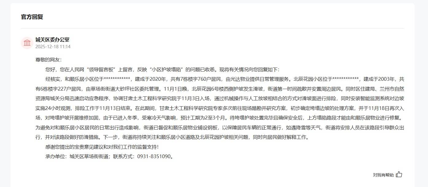 城关区委办公室在回复中解释,和顺乐居小区(建成于2020年)塌陷路段的彻底修复,需待北辰花园护坡处置完毕并确保安全后方能由其物业公司组织实施。为最大限度减少对居民日常生活的影响,街道已督促和顺乐居小区物业在受损路面临时铺设钢板。同时,街道承诺如遇降雪天气,将组织人员引导出行并落实防滑措施。