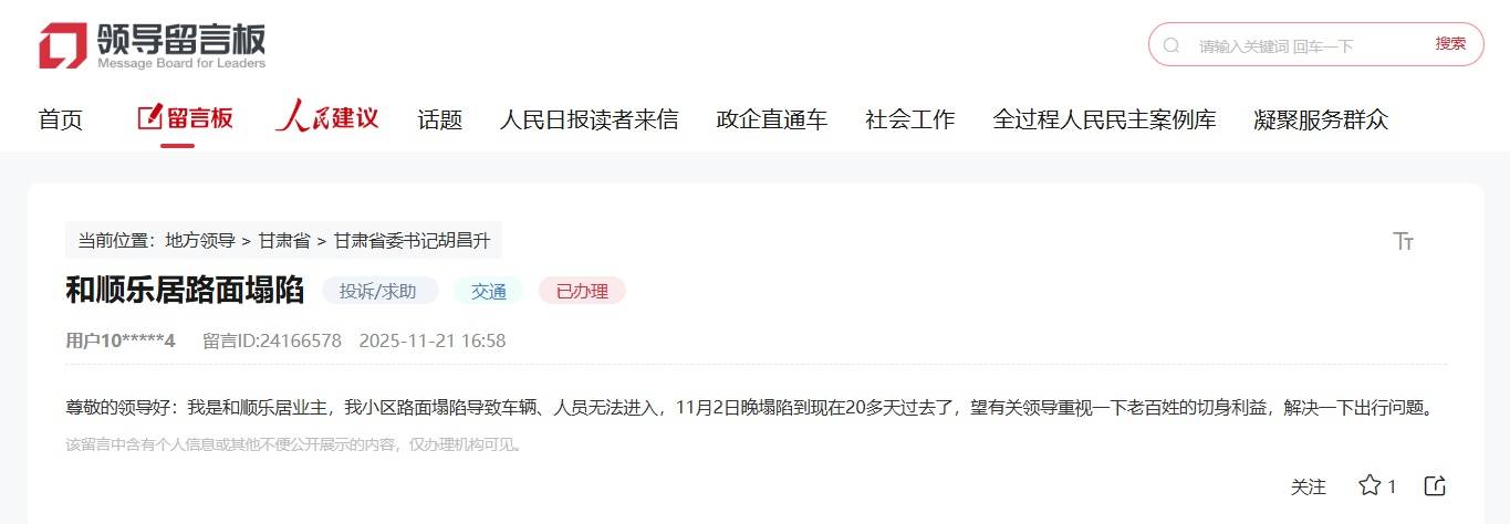 人民网兰州12月23日电 (记者米媛)近日,甘肃兰州网友在人民网“领导留言板”留言,反映其所在的和顺乐居小区路面塌陷,导致车辆人员无法进出,希望相关部门解决出行问题。