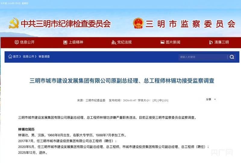 三明市城市建设发展集团有限公司原副总经理、总工程师林锡功接受监察调查通报(央广网发 截图来源:三明市纪委监委网站)
