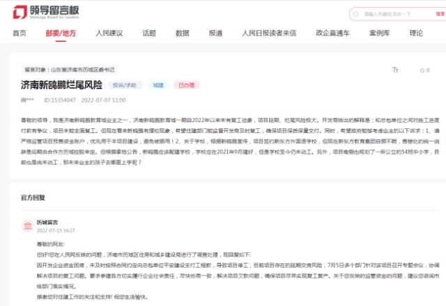 此外,济南东方和力文化产业发展有限公司开发建设的济南新鸥鹏教育城被网友投诉称:1、项目自2022年以来未有复工迹象,项目延期、烂尾风险极大。2、关于学校,根据新鸥鹏宣传,项目签约新东方外国语学校,但现在新东方教育集团自顾不暇,售楼处的统一说辞是后期由合作方历城控股来定。但根据拿地公告,新鸥鹏应该配建学校,学校应在2021年9月建好,但是学校至今仍未动工。另外,项目南侧也规划了一所公立的54班中小学,目前也是尚未动工,那未来业主的孩子去哪里上学呢?