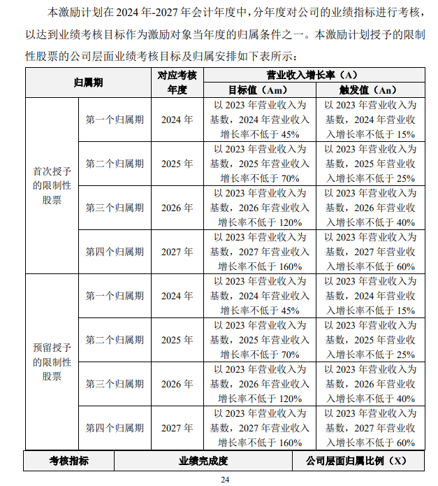 (3)2024年激励计划拟授予72名激励对象60.4659万股限制性股票,授予价格定为33.09元/股。公司层面的业绩考核要求如下图所示: