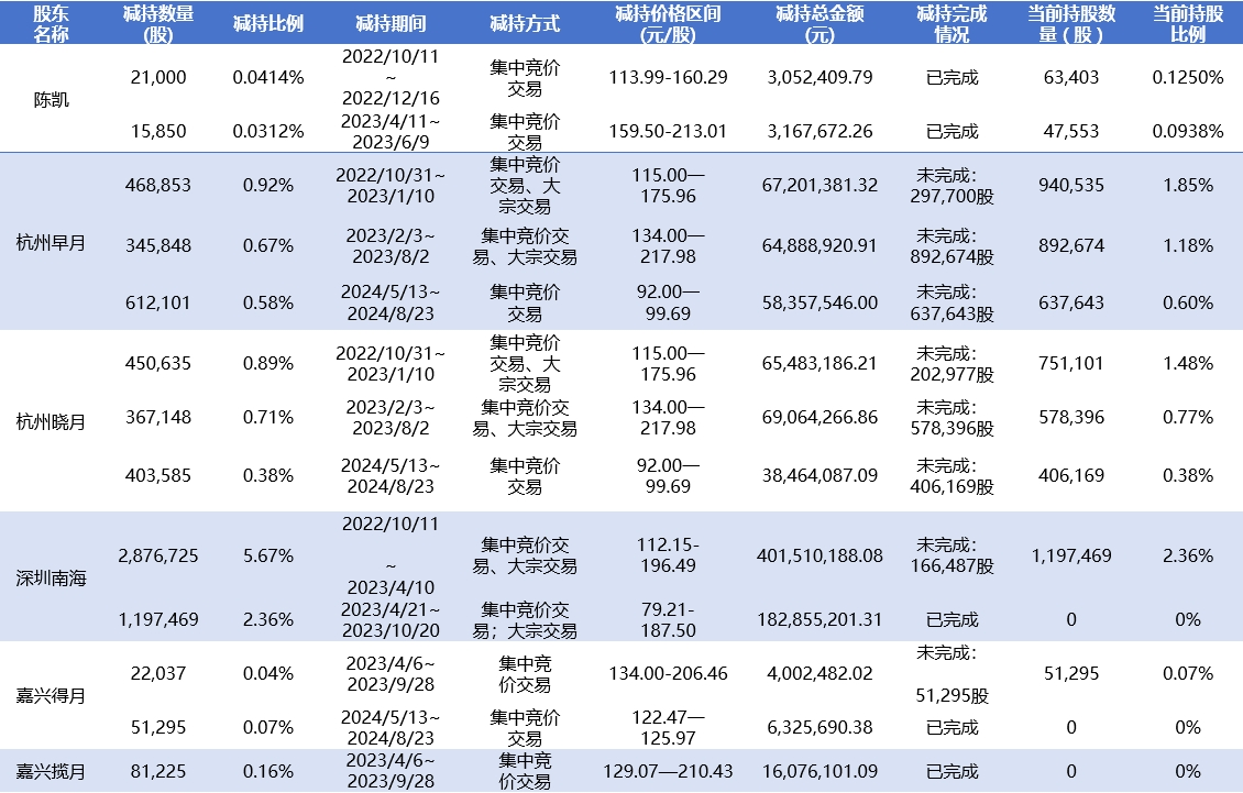 此外,原持股5%以上股东杭州早月及其一致行动人杭州晓月、嘉兴得月、嘉兴揽月,合计减持公司股份280.27万股,套现3.9亿元,持股比例仅剩0.98%;原持股5%以上股东深圳南海已清仓公司股份,共套现约5.84亿元。