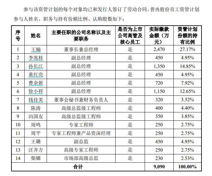 如上表所示,王楠、李兆桂、孙长江、童红亮、曹余新、徐小祥、钱佳美为普冉股份高级管理人员,其余对象均为公司的核心员工(属于公司创始团队骨干、核心技术人员、经营管理团队三者之一)。