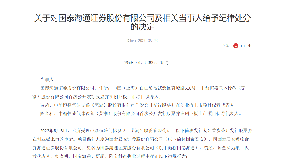 5月23日,国泰海通(601211)因在中鼎恒盛气体设备(芜湖)股份有限公司IPO项目中存在多项违规行为,被深圳证券交易所给予通报批评处分,这也是其2025年3月完成吸收合并海通证券后的首张投行业务罚单。此次处罚涉及保荐代表人贾超、陈金科被暂停签字资格半年,暴露出合并后投行业务整合过程中的合规风控漏洞。