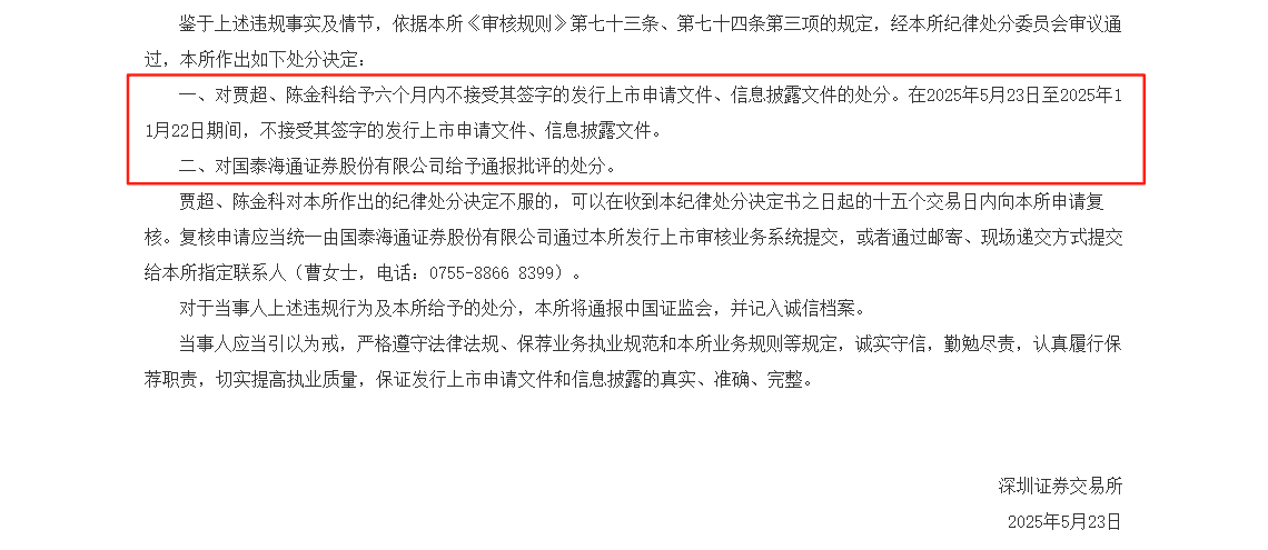 深交所指出,上述行为严重影响审核判断,反映出保荐机构未严格执行执业标准。除对国泰海通通报批评外,保荐代表人贾超、陈金科被暂停签字资格半年,涉及项目在2025年5月23日至11月22日期间不予受理。