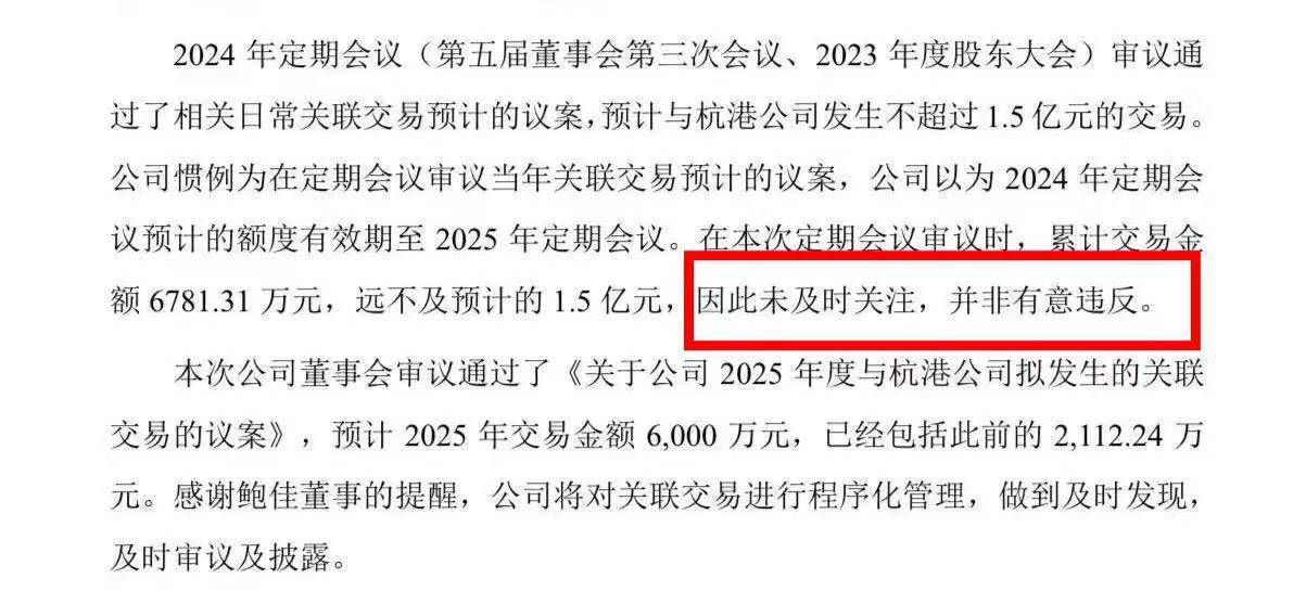 对于鲍佳所述的“违规交易”,可靠股份曾在公告中回应称,“公司以为2024年定期会议预计的额度有效期至2025年定期会议,因此未及时关注,并非有意违反”。此外,“公司2025年第一季度与杭港公司发生了2112.24万元交易”一事,并不影响公司2024年年度报告。且本次公司董事会已审议通过了《关于公司2025年度与杭港公司拟发生的关联交易的议案》(以下简称“杭港关联议案”),预计2025年交易金额6000万元,已经包括此前的2112.24万元。