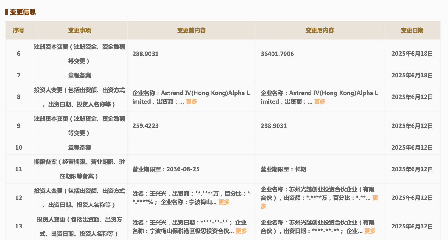 国家企业信用信息公示系统网站显示,6月12日,杭州宇树科技股份有限公司注册资本发生变更,由259.4223万元(人民币,下同)变更为288.9031万元,营业期限也变更为长期。6月18日,注册资本再次变更为36401.7906万元。