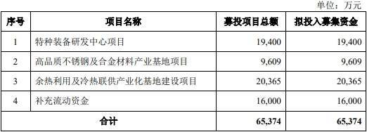 双瑞股份原拟募集资金65,374万元,分别用于特种装备研发中心项目、高品质不锈钢及合金材料产业基地项目、余热利用及冷热联供产业化基地建设项目和补充流动资金。