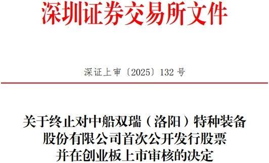 中国经济网北京7月7日讯 深交所网站于7月5日发布关于终止对中船双瑞(洛阳)特种装备股份有限公司(以下简称“双瑞股份”)首次公开发行股票并在创业板上市审核的决定。