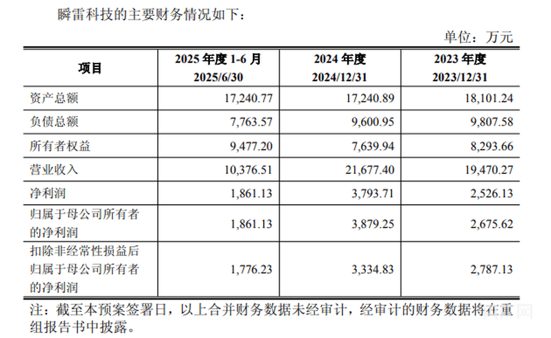 根据公告披露的未经审计合并财务数据,2023年、2024年以及2025年上半年,瞬雷科技分别实现营业收入1.95亿元、2.17亿元、1.04亿元,扣非归母净利润分别为2787.13万元、3334.83万元、1776.23万元.