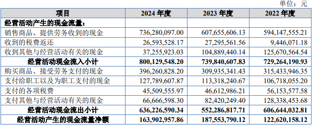 报告期内,志高机械销售商品、提供劳务收到的现金分别为5.94亿元、6.08亿元、7.36亿元;经营活动产生的现金流量净额分别为1.23亿元、1.88亿元和1.64亿元。