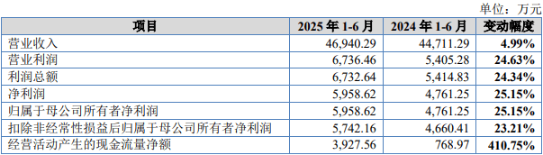 2025年1-6月,志高机械实现营业收入46,940.29万元,同比增长4.99%;归属于母公司所有者净利润5,958.62万元,同比增长25.15%;扣除非经常性损益后归属于母公司所有者净利润5,742.16万元,同比增长23.21%;经营活动产生的现金流量净额3,927.56万元,同比增长410.75%。