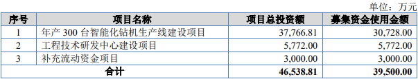 志高机械原拟募集资金39,500.00万元,分别用于年产300台智能化钻机生产线建设项目、工程技术研发中心建设项目、补充流动资金项目。