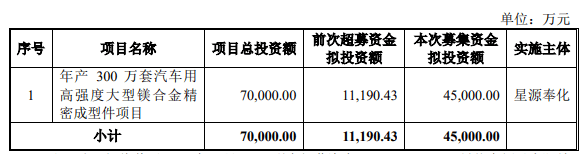 星源卓镁2025年8月14日披露的向不特定对象发行可转换公司债券募集说明书(修订稿)显示,公司本次申请向不特定对象发行可转换公司债券拟募集资金总额不超过45,000万元(含),所募集资金扣除发行费用后,拟用于以下项目的投资:年产300万套汽车用高强度大型镁合金精密成型件项目。