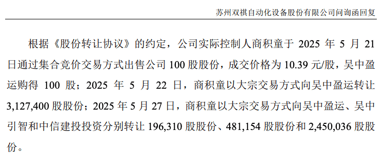 此外,2025年5月,商积童通过集合竞价、大宗交易方式分别向吴中盈运、吴中引智、中信建投投资转让5.31%、0.77%、3.92%股份,并约定了 股份回购、回购终止及恢复条款。北交所要求发行人说明保荐机构子公司中信建投投资入股价格是否公允,是否依规履行内部决策或审查程序,是否涉及利益输送、利益冲突或其他安排。
