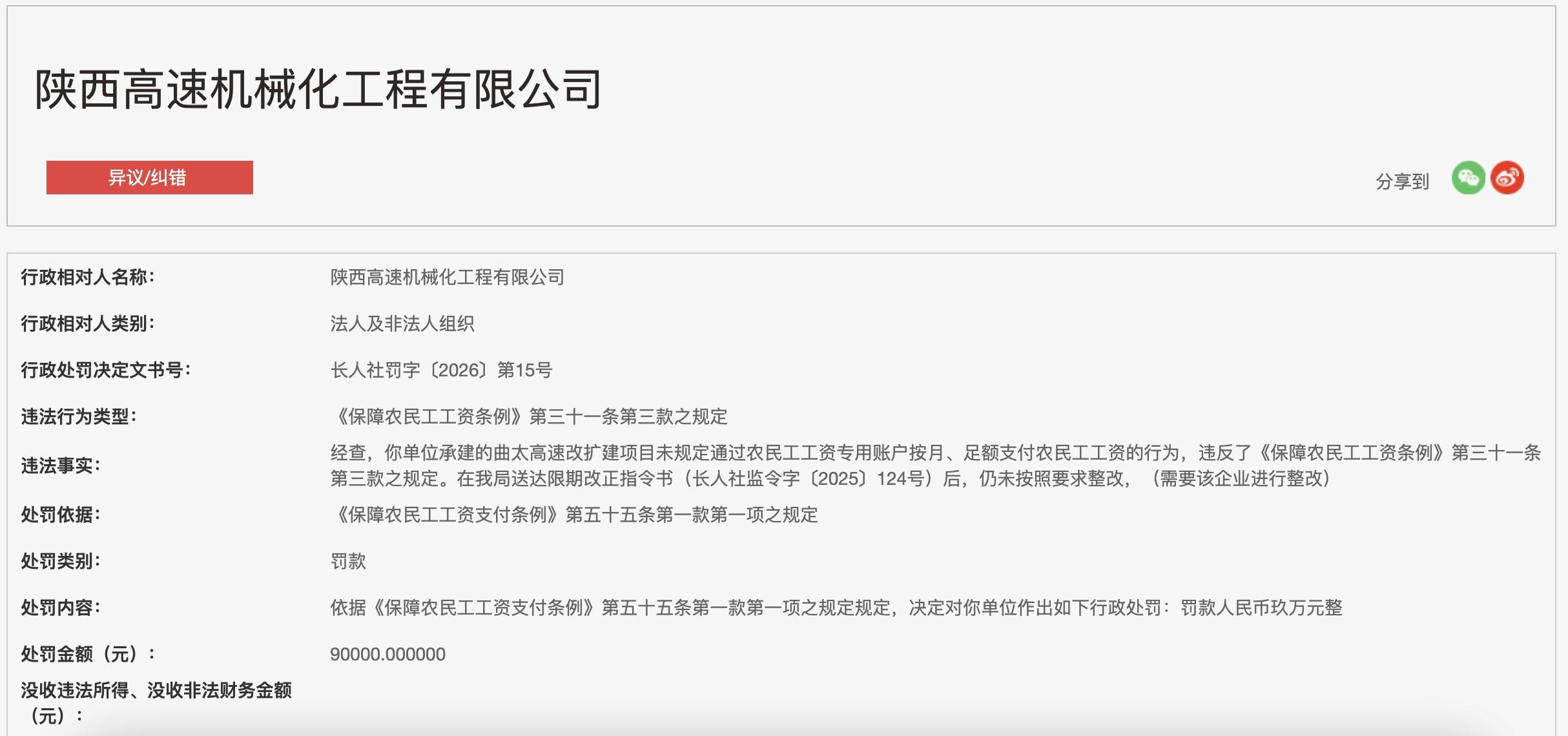 信用中国(陕西西安)网站近日公布的一份信用公示显示,陕西高速机械化工程有限公司在一项目中,未规定通过农民工工资专用账户按月、足额支付农民工工资,且在西安市长安区人力资源和社会保障局送达限期改正指令书后,仍未按照要求整改,被处罚9万元。