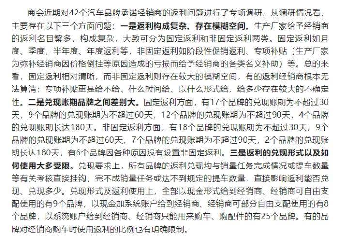 全国工商联汽车经销商商会表示,在当前市场情况下,汽车生产厂家对经销商承诺的返利能否及时兑现,对缓解经销商资金压力、改善经销商经营状况至关重要。同时,与其他供应链企业相比,经销商的返利不仅仅是兑现账期问题,还包括返利政策是否清晰、返利使用是否受限等商务政策问题,如只明确相应的兑现账期而不对不合理的商务政策进行调整,很难从根本上解决问题。