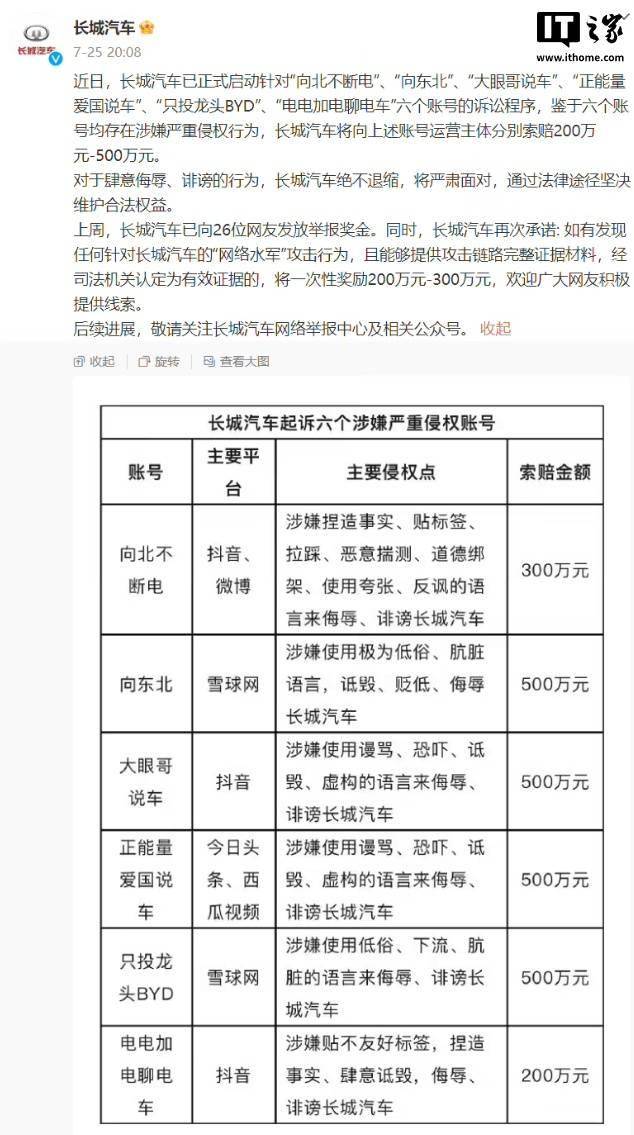 IT之家查询获悉,长城汽车网络举报中心曾在 2023 年 9 月发文宣布,长城汽车已正式启动针对“向北不断电”“向东北”“大眼哥说车”“正能量爱国说车”“只投龙头 BYD”“电电加电聊电车”六个账号的诉讼程序,鉴于六个账号均存在涉嫌严重侵权行为,长城汽车将向上述账号运营主体分别索赔 200 万元-500 万元。